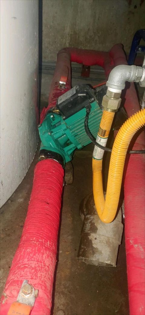온수기 배관과 연결된 바닥에 있는 녹색 모터? 같은