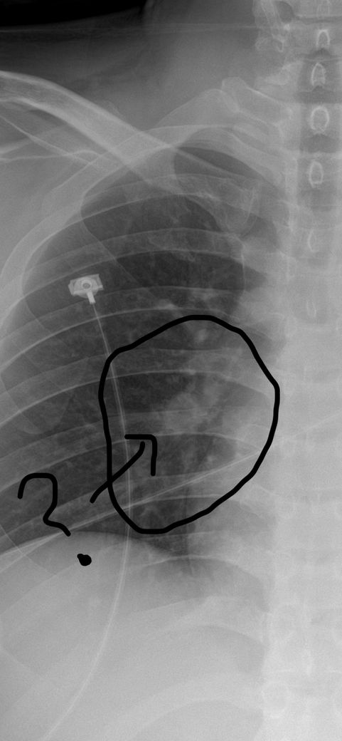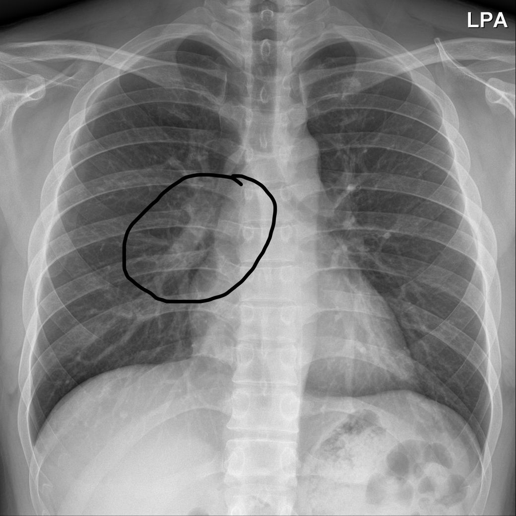 엑스레이에서 특별한 이상은 보이지 않는다고 하셨는데, 우연히 2018년 찍은 사진과 비교해보니 동그라미 친 곳 안에 기관지로 보이는 하얀 관이 코로나 전에는 뚜렷하게 깨끗히 이어진 통로가 보이는 반면,