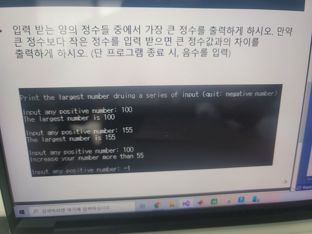 #include <stdio.h> int main(void) { int max = 0; int num1; for (int i = 0; i < 10; i++) { printf("input any positive number: "); scanf("%d", &num1); // 표준 입력을 받아서 변수에 저장 if (num1 < 0) return 0; if (num1 > max) { max = num1; printf("The largest number than %d\n", num1); } else { printf("Increase your number more than %d\n", max - num1); } } return 0; }