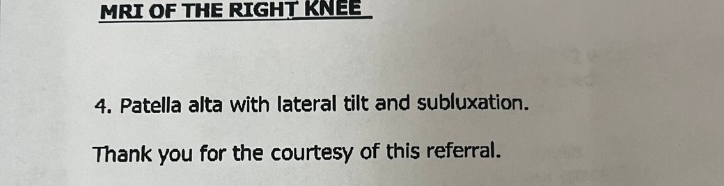 마지막으로 'patella alta with lateral tilt and subluxation'은 무릎뼈가 정상 위치보다 높게 위치해 있으며, 옆으로 기울고 부분 탈구가 있다는 것을 의미합니다. 이는 무릎의 안정성과 기능에 영향을 미칠 수 있습니다.