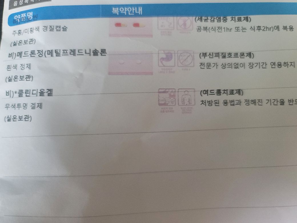 염증이 많이 있는경우에는 스테로이드를 한알반씩 복용을 하기도 하지만, 심하지 않은 경우에는 피부과약의 반알 메드론은 우선 빼고 함께 복용을 하길 권장드립니다.