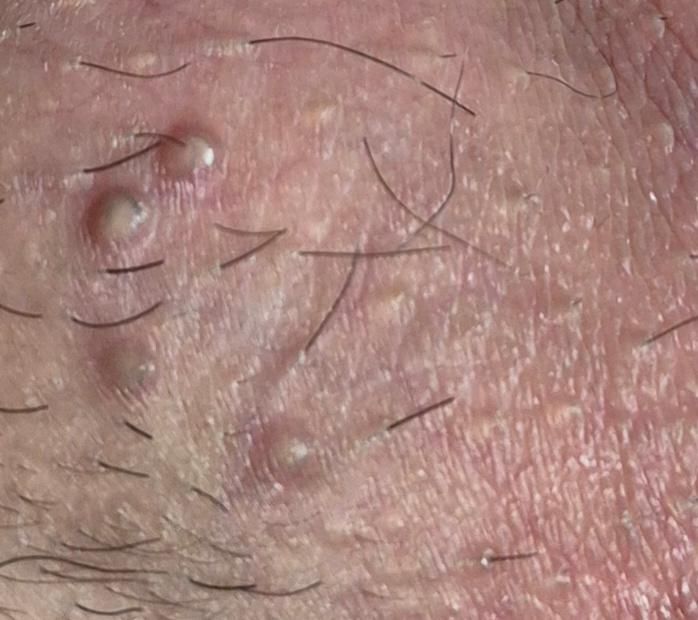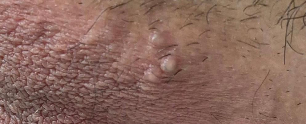 사진 소견을 통해서 구체적인 감별 진단까지 내리는 것은 어렵습니다만 곤지름의 가능성은 낮아 보입니다. 군집된 수포성 병변으로 보기에도 어려우며 헤르페스의 가능성도 높아 보이지는 않습니다. 모낭염 같은 소견일 가능성이 높아 보입니다. 실질적인 감별 진단 및 치료를 위해서는 진료 및 검진을 받아보는 것이 적절할 것으로 사료됩니다.