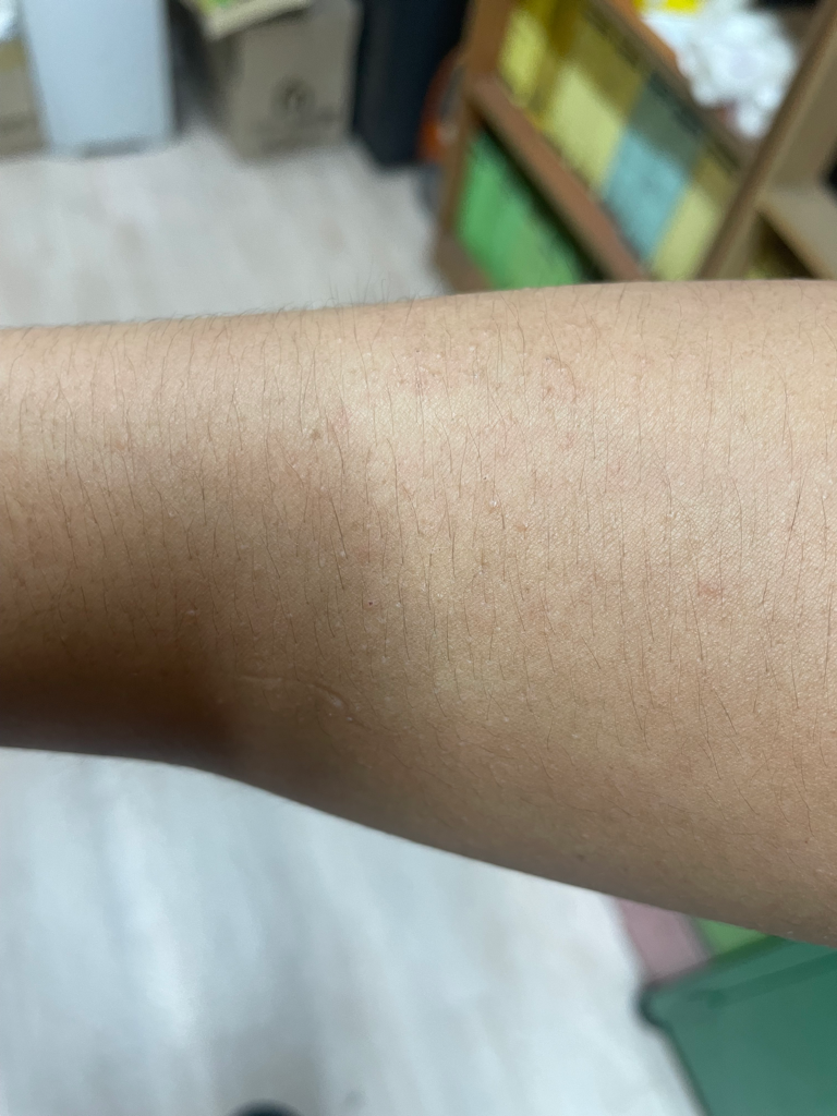 각질형성이 지나치게 많아 땀구멍, 털구멍을 막아 닭살같이 오돌토돌하게 돌기를 형성합니다.