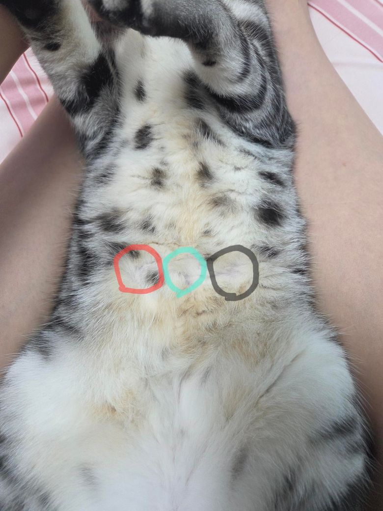 첫번째 사진은 꼭지가 있는 부분에(이게 꼭지 부분인지는 밑에 다시 설명해드릴게요) 무슨 사람으로 치면 블랙헤드나 피지마냥 하얀색 뭐가 툭 튀어나와서 이게뭐지하고 슥 했는데 떨어져가지고 아.. 이건 병원을 가야겠다 싶어서 병원을 갔는데 애기가 너무 싫어해가지고ㅠㅠ 발버둥을 쳐서 의사선생님한테도 일단은 사진으로만 보여드렸는데 육안으로 보지를 못하셔서 세균성병변이라고 일단은 진단을 받고 소독약이랑 연고를 처방받았습니다. 그런데 인터넷에 이것저것 찾아보니까 함몰유두에 저렇게 피지가 쌓여서 나오기도 한다고하더라구요? 그래서 어떤건지 잘 몰라가지구 글을 남겨요. 약을 바르면 낫을까요? 선생님이 넥카라를 씌워라했는데 얘는 넥카라를 너무 싫어해서.. 그리고 제목에서 보셨다시피 저 피지처럼 보이는 부분옆에 땜뺑마냥 털이 하나도 없고 허옇게 피부만있어서 발진도 없고 가려워서 거기를 하루종일 햝는다거나 그러지않습니다. 두번째사진이 땜빵인데요ㅠㅠ 저것도 누구는 배꼽이라고하고 어떤사람은 곰팡이성피부염이라하고 말이 다 달라서 이것도 의사선생님한테 보여드리고싶었지만 아이가 너무 발버둥을 치는 바람에 보여드리지는 못하고 사진으로만 보여드렸어요ㅠㅠ 첫번째사진이 꼭지 부분이라는걸 어떻게 알았냐면 그 옆에 맞은편에 꼭지가 있더라구요! 말로 설명한다면 1.꼭지 2.땜빵 3.꼭지 이런 수순으로 있다는거죠 전체샷은 멀리서 찍어서 사진이 더 안보이는데 일단은 올려보겠습니다ㅠㅠ 사진에 빨간색 민트색 검은색 순으로 꼭지.땜빵.꼭지 순이거든요ㅠㅠ 의사샘들.. 잘 한번만 봐주세요 부탁드립니다 그리고 곰팡이성피부염이라고하면 진료를 어떻게하는지 비용은 얼마나 들면서 치료할때 어떤식으로하는지 치료기간은 얼마나 걸리는지 등을 알고싶습니다ㅠㅠ (현재까지 빨갛게 발진이 생기거나 진물이나거나 가려워서 미친듯이 긁는다거나 그런 반응들은 전혀 없습니다)