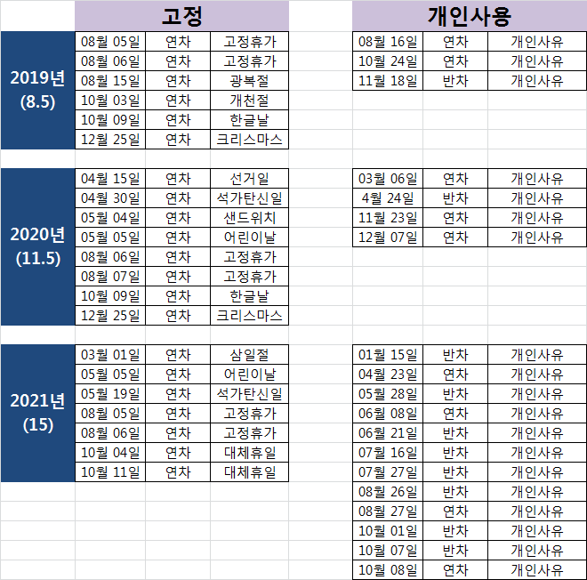 2. 위 총 연차 사용갯수를 더하고, 연차대체합의가 있는 경우 대체일을 모두 합한 뒤,