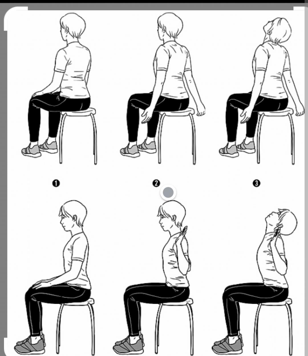 의자에서 상체를 앞으로 살짝 숙였다가 펴는 동작, 양손 깍지 끼고 위로 쭉 뻗는 스트레칭을 30초씩 3회 해주세요.