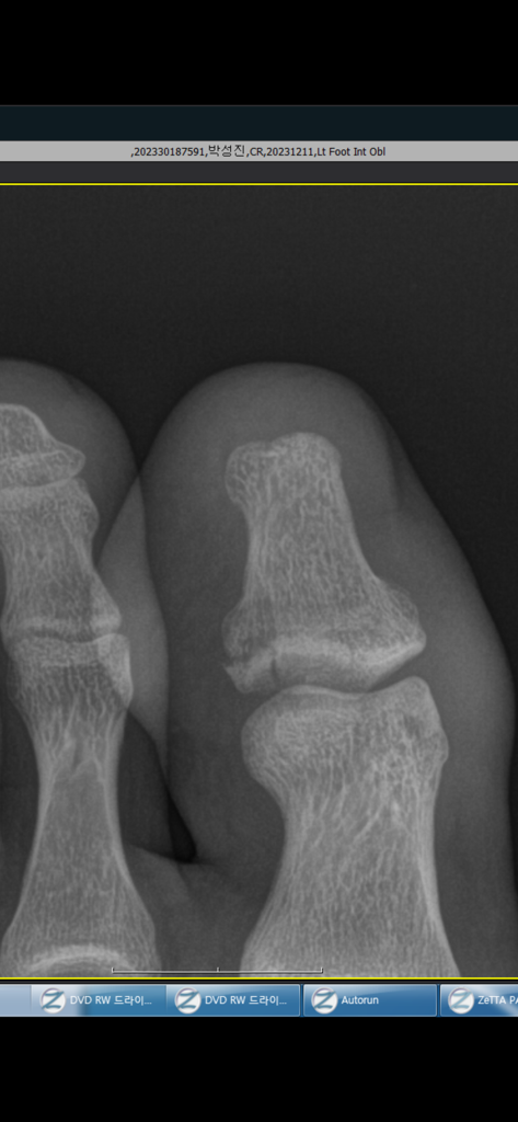 이렇게 원위지골의 전위가 발생하여 불유합 가능성이 높다고 진단을 받았습니다. 저렇게 뼈가 조각나서 전위가 발생했네요.