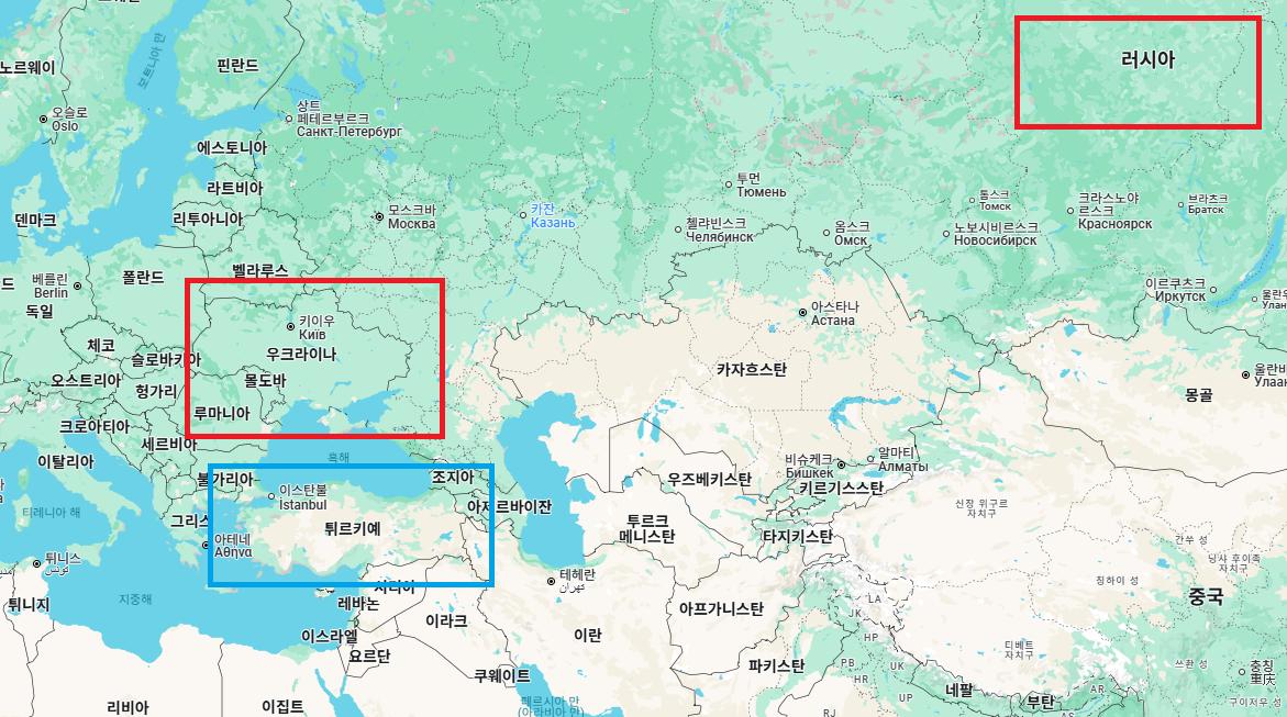 튀르키에는 러시아 우크라이나와 모두 국경을 접하고 있죠.
