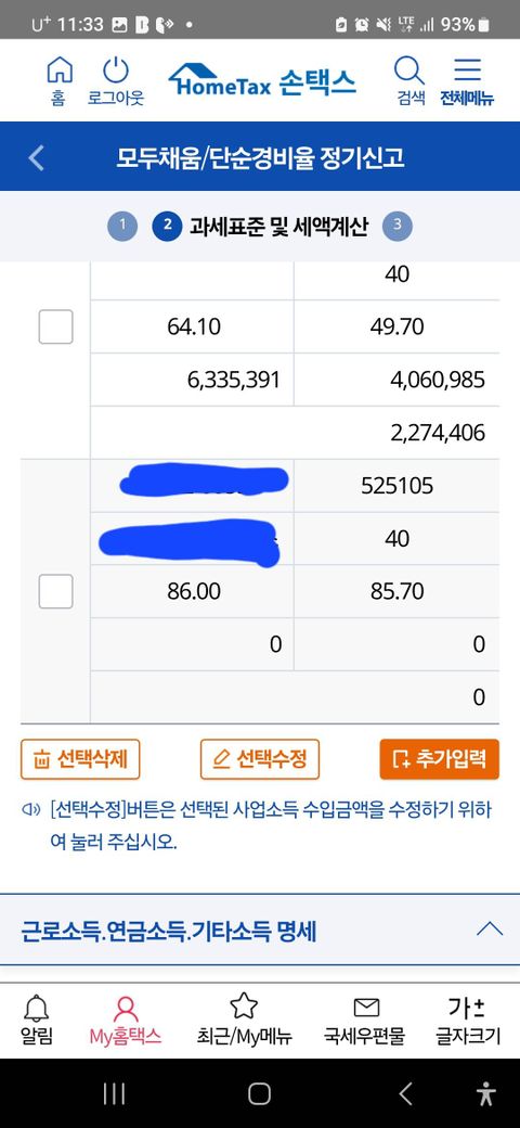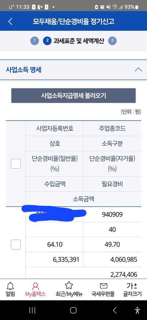 앱테크 소득은 사업소득지급명세서가 제출되었기 때문에 금액이 잡히지만, 네이버스토어 소득은 본인이 직접 수입금액을 산정하여야 하며, 직접 경비를 공제하거나 추계경비율을 적용하여 신고서를 작성하여야 합니다.
