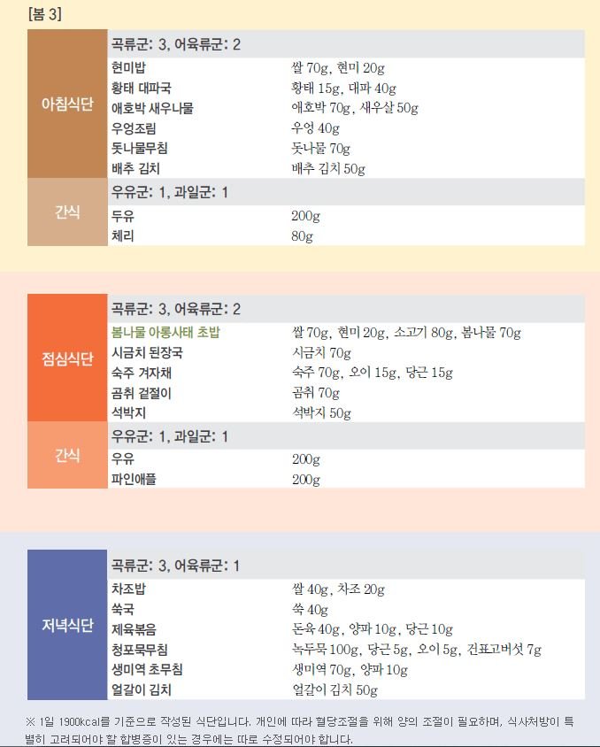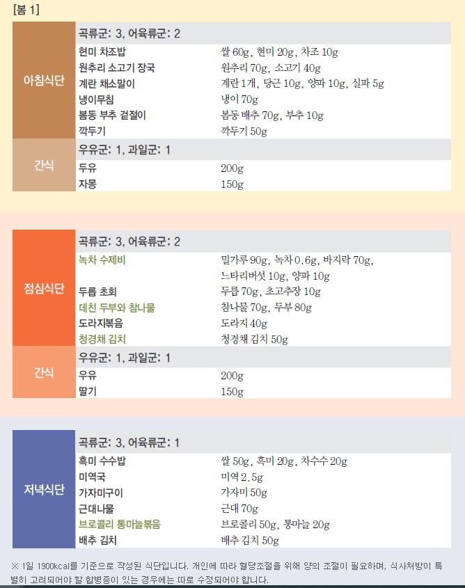 아래 당뇨병학회에서 제안한 봄철 식단 2가지 예시를 올려드리니 참고바랍니다.
