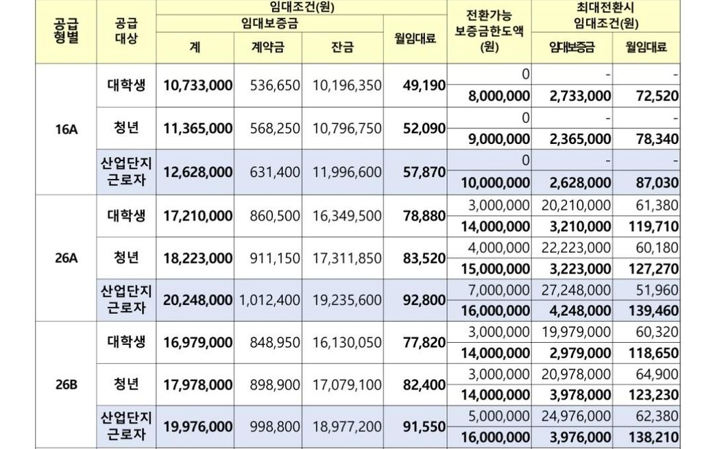 보여주신 자료는 LH청년주택으로 LH청년전세자금대출과는 다른 것입니다. 말씀하신 조건으로 확인하시려면 맨오른쪽에 있는 임대보증금과 월임대료만 확인하시면 납부액을 알 수 있습니다.