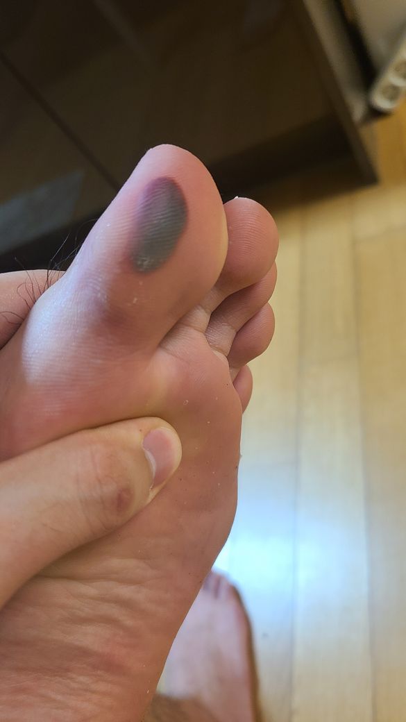물집이 잡히고 피가 차면서 검게 멍이 든 상황으로 보입니다. 양말이나 신발을 먼저 점검해보시기 바라며 해당 병변은 되도록 건들지마시고 추후 터진다면 소독이 필요합니다.