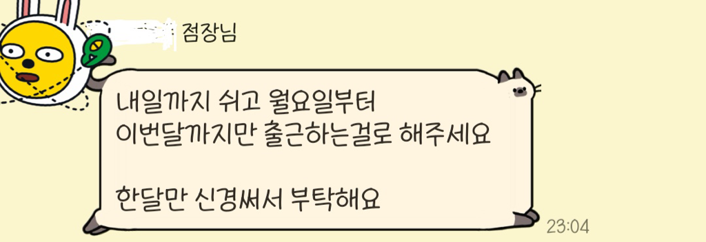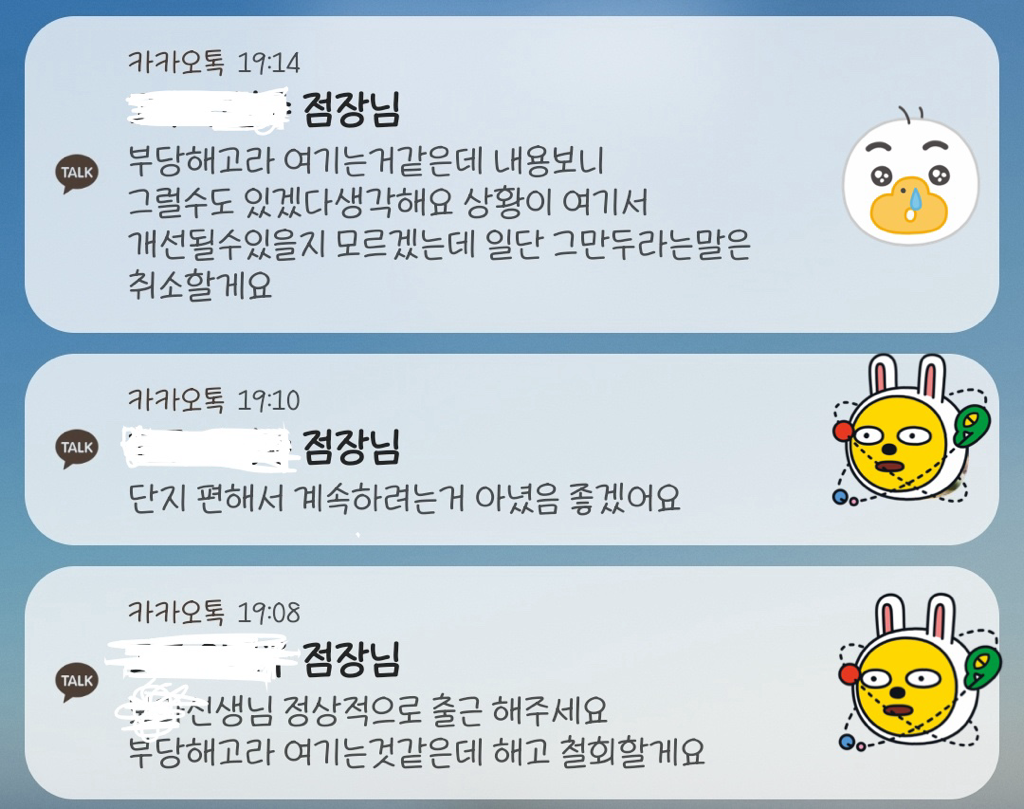 이후로도 대화를 더 해봤지만 반복된 강요를 해오길래 "저는 시간변경 거절의사를 분명히 밝혔고 퇴사의사가 전혀 없으니, 해고하시려는 것이 아니라면 다음주 오전에 정상 츨근하라고 연락주세요"라고 했습니다.