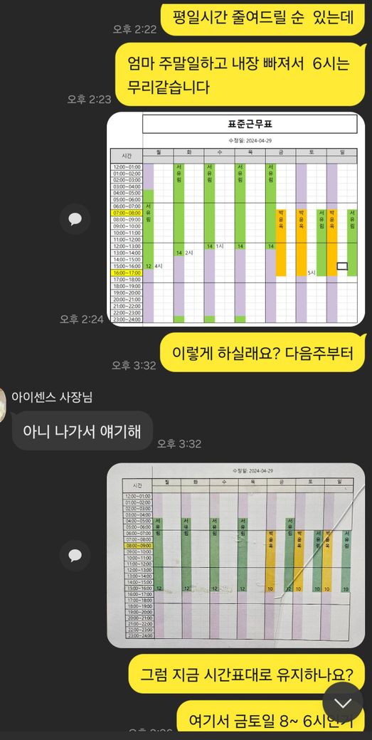 원래 4시퇴근인데 말도없이 계속 늦게와서 말하니