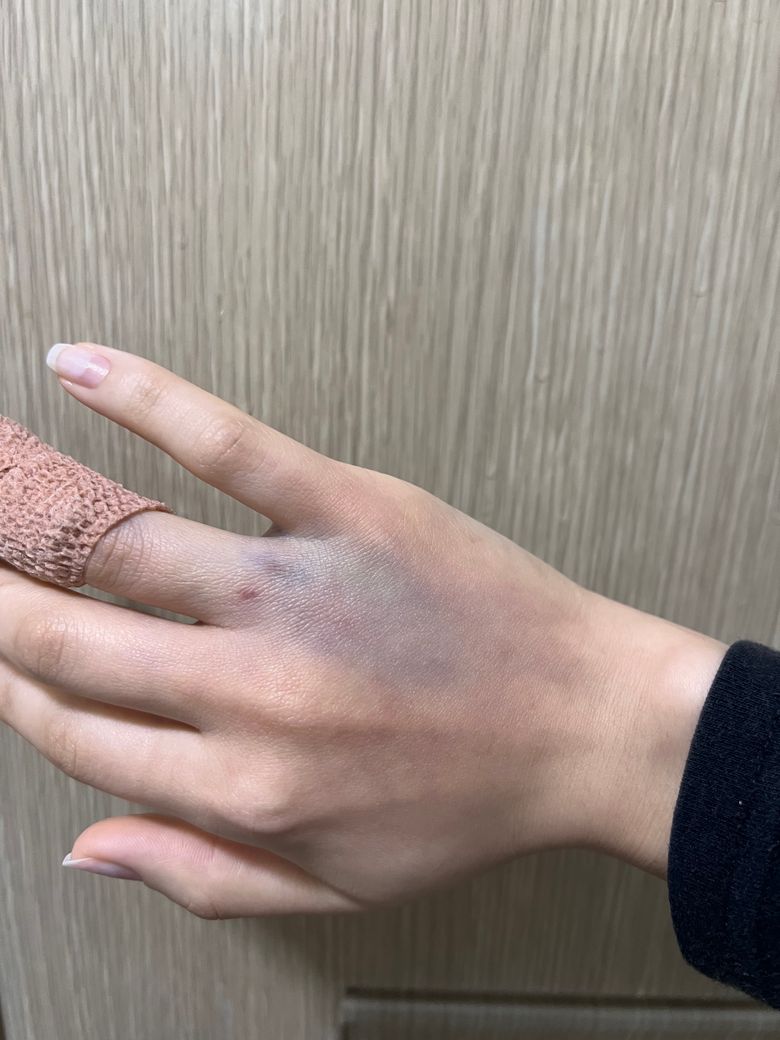 젤 네일을 하고 있던 손가락이 침대에 찍혀서 중간이 부러져 출혈이 발생하여 정형외과에 방문하여 손톱과 손가락을 봉합하였고 마취 후 멍이 드는것 관련해서 질문을 주셨는데, 마취 주사를 맞으면 멍이 들 수 있습니다.