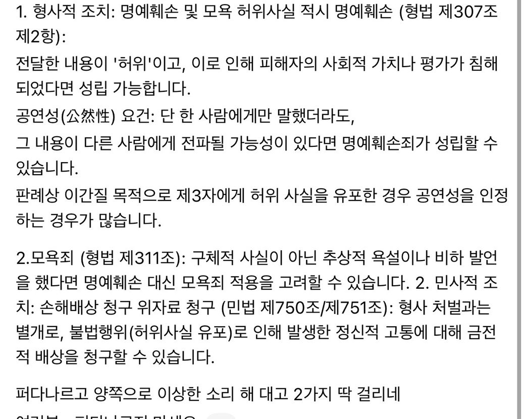 법 조문 자체를 인용하여 그 자체는 맞는 말일 수는 있습니다. 전파가능성에 관한 부분 역시 단 한 사람에게만 말했더라도 다른 사람에게 전파될 가능성이 있으면 성립할 수 있다는 문장은 원칙적으로는 맞는 설명으로 볼 수 있지만, 실제 사건에서는 누구에게, 어떤 관계에서, 어떤 맥락으로 말했는지에 따라 성립하는지가 다르기 때문에 위의 내용만을 가지고 사실관계에 관한 정확한 확인 없이 어느 쪽 의견이 맞다 틀리다 하기는 어렵겠습니다.