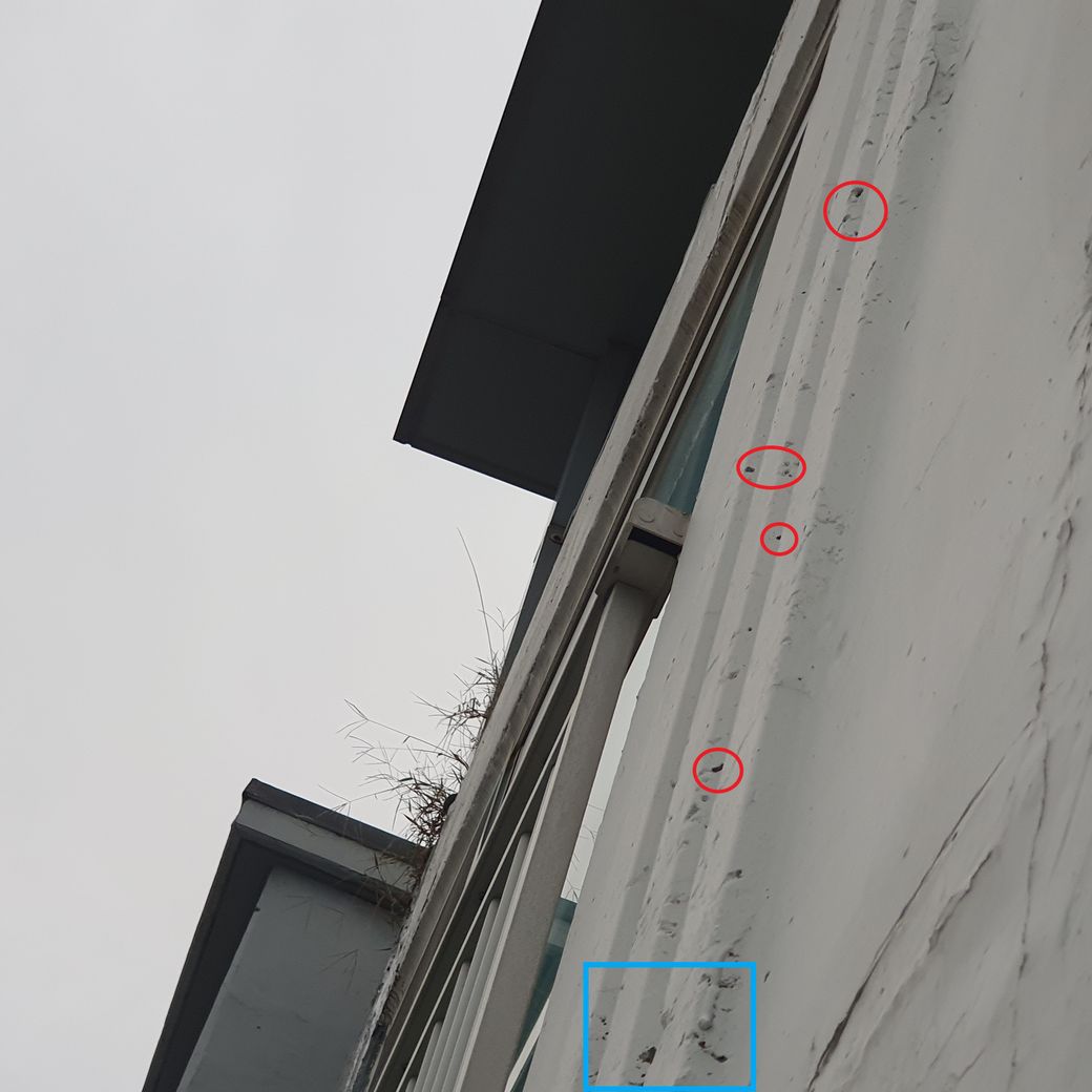 근데 오늘 또다시 누수가 되어 윗층(20층) 옆 외벽을 카메라로 찍어서 확대해 보니 빨간색이나, 특히 하늘색 표시 부분에 구멍 등 크랙이 많이 보이는데, 이것이 저희 집 누수 원인이 될 수 있는지 전문가님들의 고견을 고합니다.
