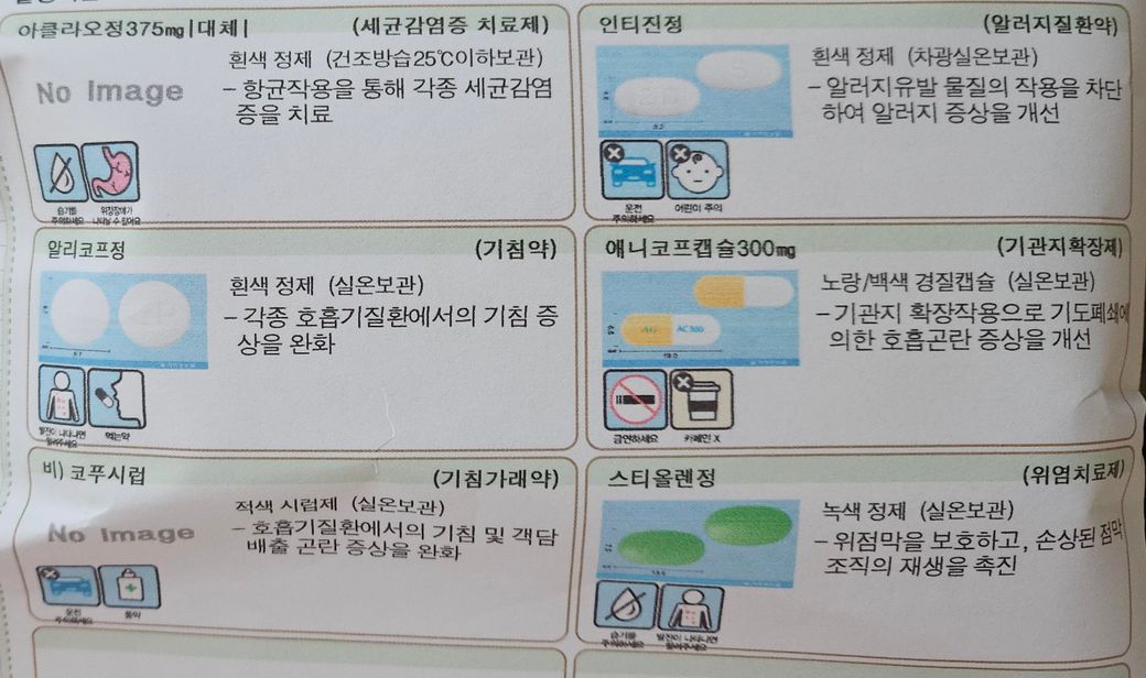 2일 전부터 오한, 두통, 기침/가래가 생겼고 어제부터는 콧물도 많이 나기 시작해서 오늘 병원 진료 후 사진의 약들을 처방받았는데요,