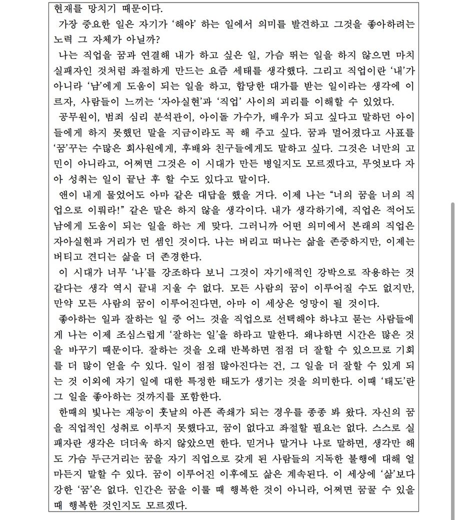 -답변 : 꿈을 직업으로 삼는 것만이 행복한 것은 아니고 사회자체가 다양한 가치를 존중해줘야 한다