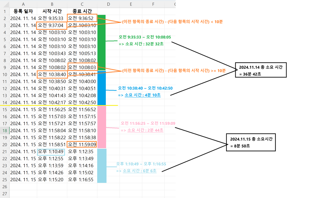 안녕하세요, 날짜 별 시작 시간과 끝 시간을 이용해서 날짜별 소요시간을 계산하고 싶은데요,