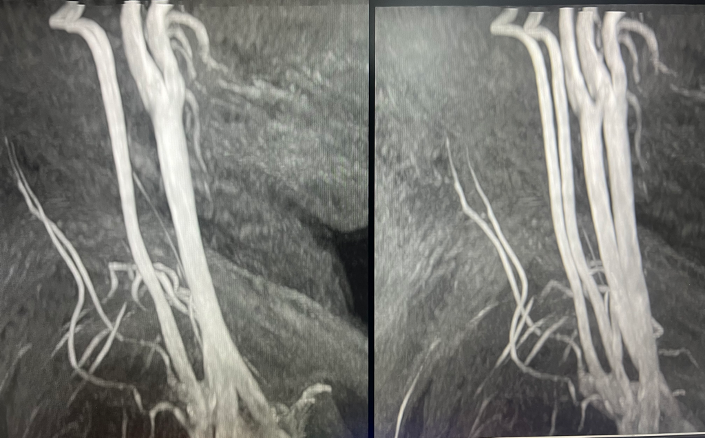 목의 혈관 사진은 모든 각도를 돌아보며 관찰해야 하지만 보이는 사진으로는 깨끗하고 혈류도 좋아보입니다. 증상의 원인을 다른 곳에서 찾아보셔야 하겠습니다.