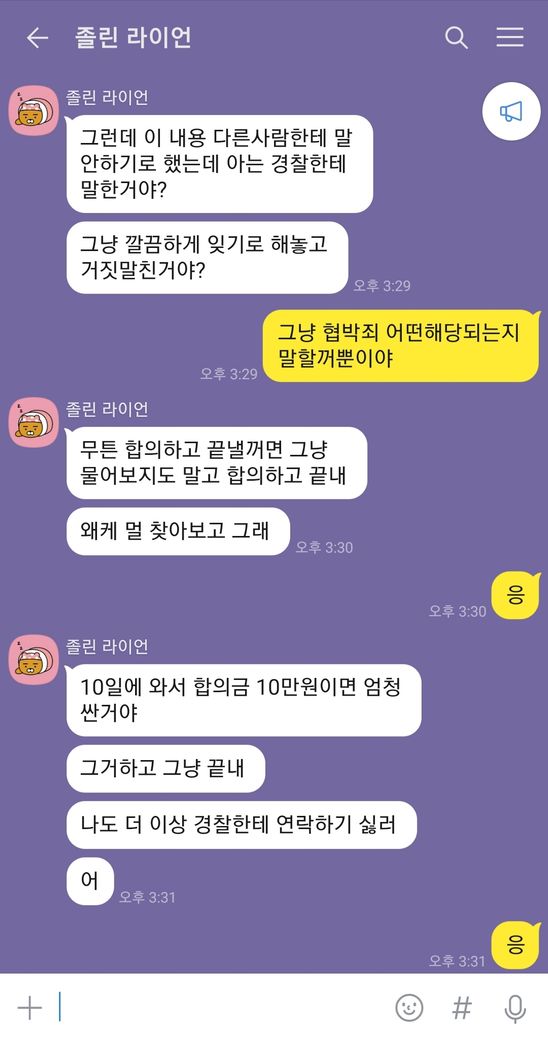 10만원 합의금 하자고하고 안주면 다시 전화해서 신고하겠다고