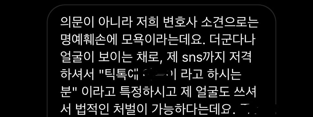 제가 한 옷팔이 틱톡커에 대한 글을 익명 커뮤니티에 작성했습니다.(사진) 글 내용은 그분의 틱톡 영상 사진 몇장과 함께 ‘이 틱톡커는 유학하면서 단칸방에서 살고 어쩌고 하면서 엄청 가난하게 살았다는데 유학시절 사진을 보면 이미 성형한 상태인데(누가봐도 성괴라는 말 나올만큼 눈코입턱 전부 심각해요 강남미인 그자체,,, 다른 사람들도 다 동의한 내용입니다) 성형할 돈을 유학할때 생활비에 썼으면 그렇게 힘들지 않게 살았을텐데 왜 그런거지..? 라고 글을 작성했습니다. 글 본문에는 이 분에 대한 욕설이나 모욕(성괴라는 등 그런 불쾌감을 주는 용어조차 일절 사용하지 않았습니다)을 주는 단어는 없고 저도 그분을 욕할 의도가 아닌 정말 단순한 의문으로 쓴 글입니다 제가 욕할 의도였으면 성괴 미친년 주제에 궁상떠네 이런식으로 글을 썼겠죠.. 그리고 당일 그분 틱톡에 그 글에 대해서 영상이 올라왔고 그분은 본인 영상에서 pdf있다 너네부모님 얼굴 봐야겠다 하루안에 본인 실명으로 인스타디엠해라 그러면 봐주겠다(현재는 이 영상이 내려갔습니다)라는 영상이 올라왔길래 이 익명 커뮤니티 특성상 고소해봤지 못잡는걸 알지만 댓글창에 성괴라는 댓글 등등이 달려서 제가 그분들까지 대표하는 마음으로 연락드려서 사과했습니다 근데 고소를 하려는것같네요..? 디엠에서도 이러던데 이정도 글 가지고 고소가 되나요? 애초에 틱톡 자체가 남들 다 보라고 올리는 공간이고 자기는 거기 당당하게 올린거면서 왜 그러는거죠?
