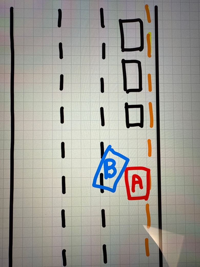그런데 2차로에서 꽤 빠르게 달려오던 차량(B)이 제 차량(A)앞에 정차하려다가 위 사진과 같이 사고가 났습니다.