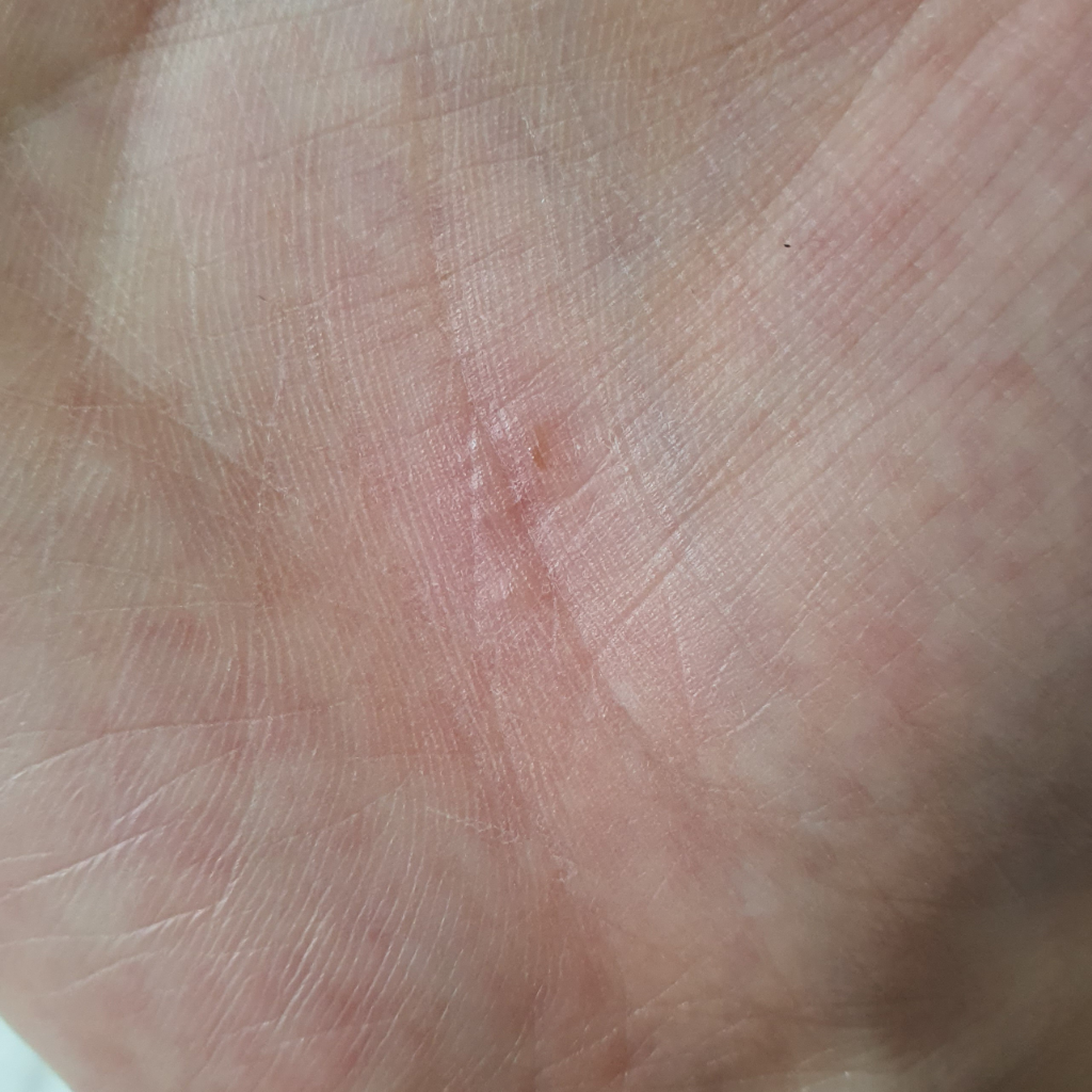 습진의 한 종류로 보이나 간혹 손바닥 무좀 역시 같은 모습을 보이게 됩니다.