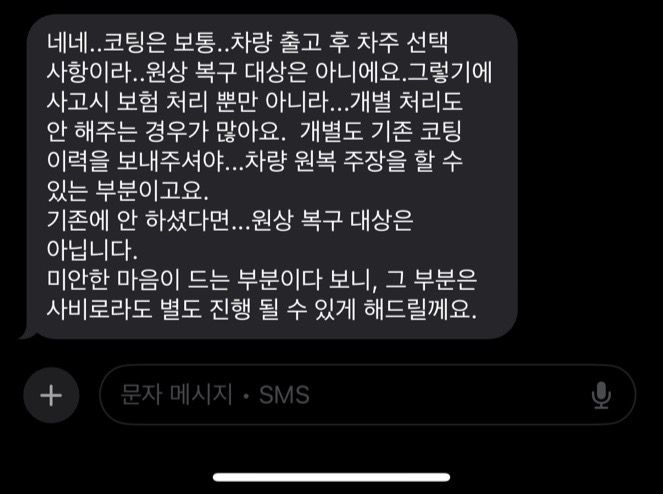 카센터측에서 대리기사가 들어있는 보험이 자차보험뿐이라 유리막보증에 대한 보험은 진행이 안된다고 계좌이체를 해주셔야 한다고 이야기 했고 대리기사에게 전달을 하니 기존에 안되어있다면 원상복구는 안해도 되지만 사비로라도 해드리겠다 라고 문자로 보냈습니다 하지만 유리막은 원래 되어있던 부분이여서 진행을 했고 연락을 한 후 대리기사는 연락이 두절되었습니다 수차례 연락을 해도 문자 답장도 없고 전화를 해도 콜백이 돌아오지 않았습니다