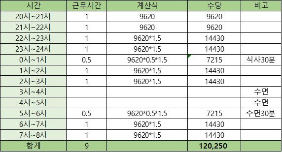 평일 야간 근무 수당 계산 맞게 했나요?