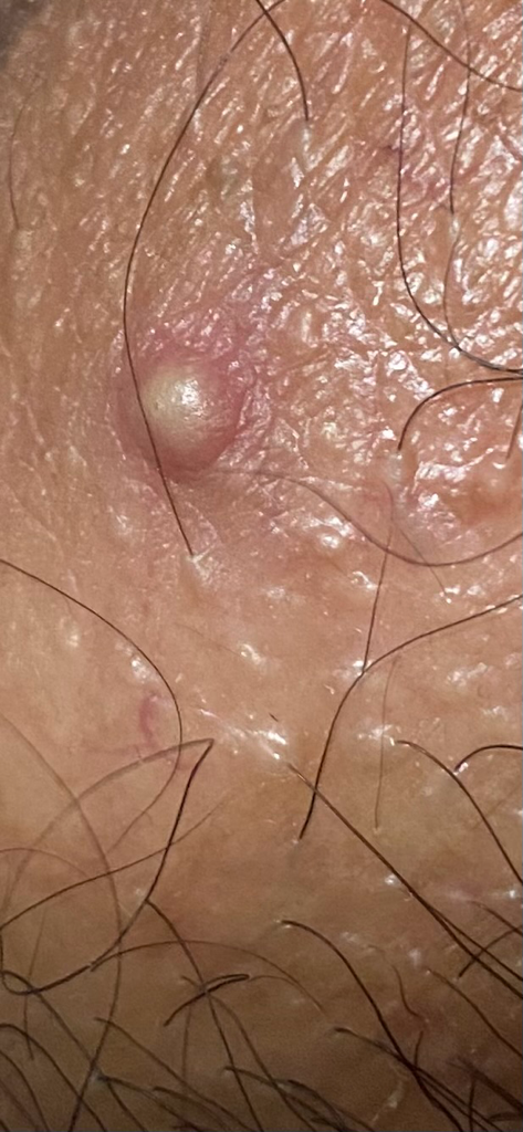 헤르페스의 수포성 병변보다는 모낭염의 화농성 병변에 더 가까워보입니다. 피부과나 비뇨의학과를 방문해 치료받아보시기 바랍니다.