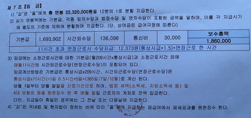 연봉제 계약서에 나와있는 임금 부분(2021년)입니다.