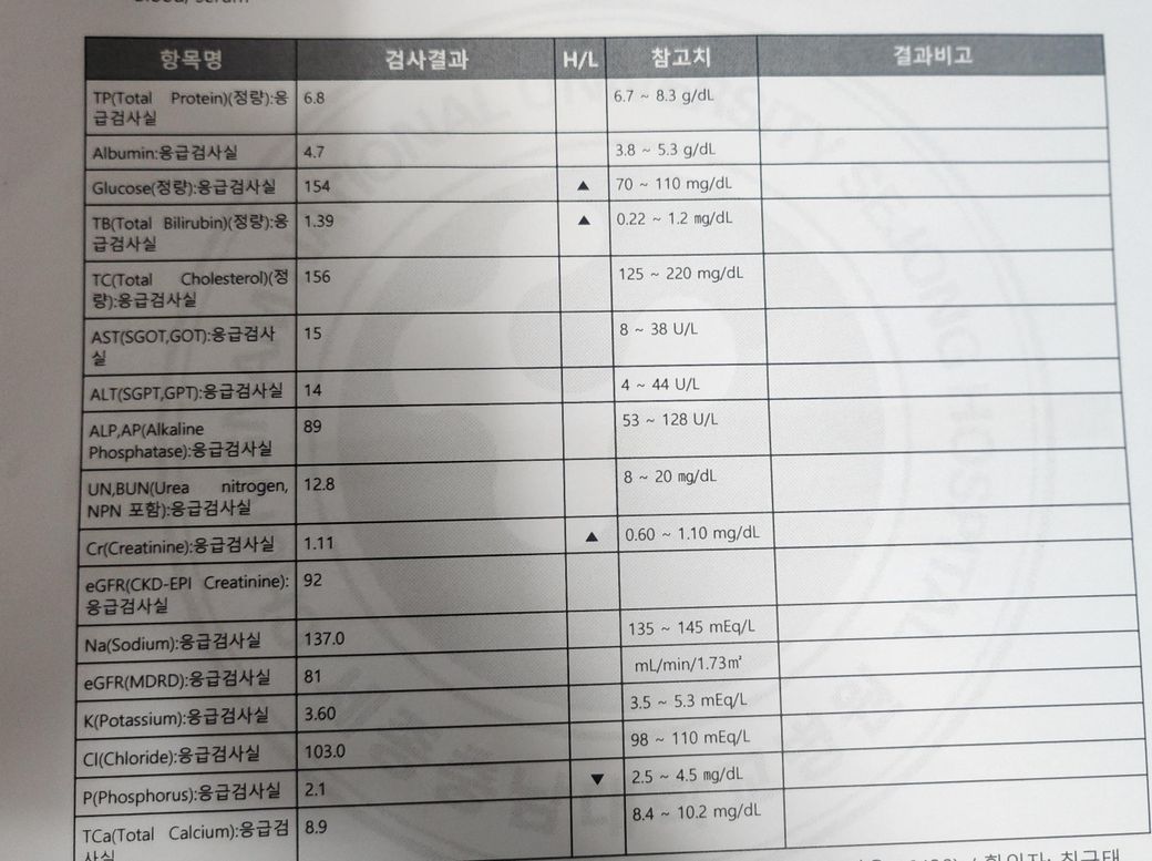 Creatinine(크레아티닌): 1.11 mg/dL (참고치: 0.60-1.10 mg/dL).