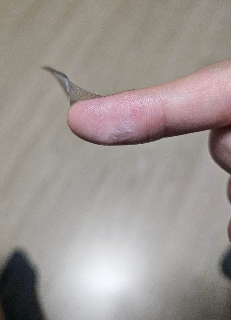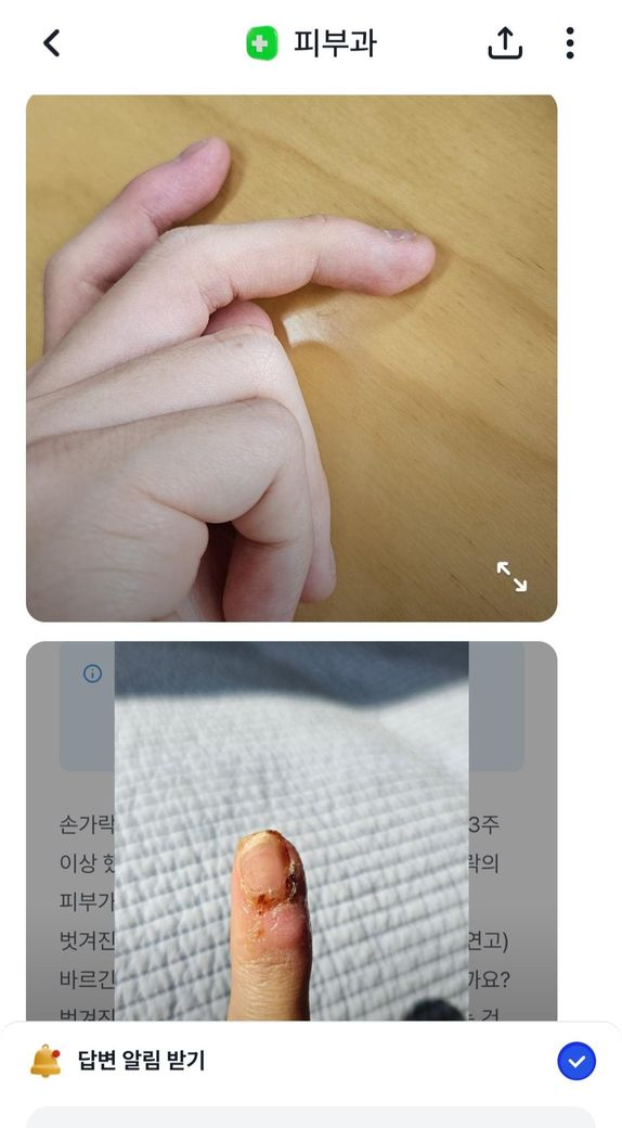 피부과에서 피부회복이 느린 손가락을 많이 사용하지 말거나 뭔가로 감싸면 좋다길래 밴드로 한 번 감쌌습니다. 근데 사진에 나오다싶이 일정 부분이 하얘지고 조금 쪼그라들었습니다.