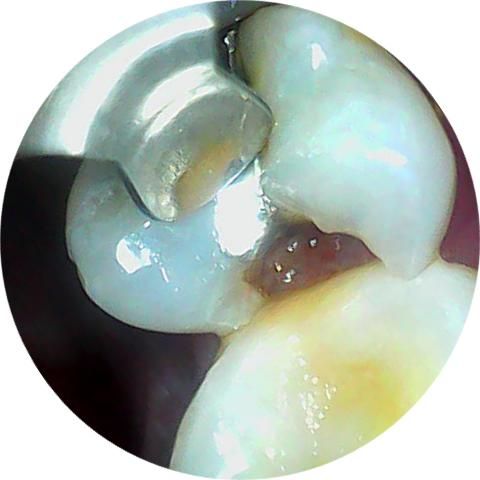 이전의 아말감이 떨어져 나가고 내부로 충치가 생긴것으로 보입니다. 해당부위에는 이물질이 끼게 되어 충치가 더 생길수 있으며 치아가 파절될수 있기때문에 빠른시일내에 치료를 해주는것이 좋습니다.