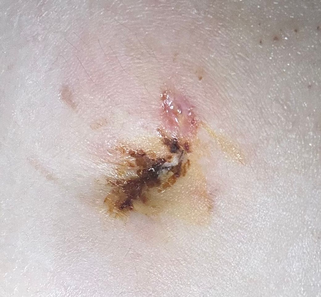 올려주신 사진으로 미루어 갈색 부분은 포타딘 소독약이 굳은 자국으로 생각되나 윗쪽 부위는 염증이 의심되므로 소독과 치료를 받기 바랍니다.