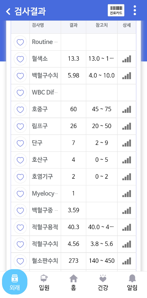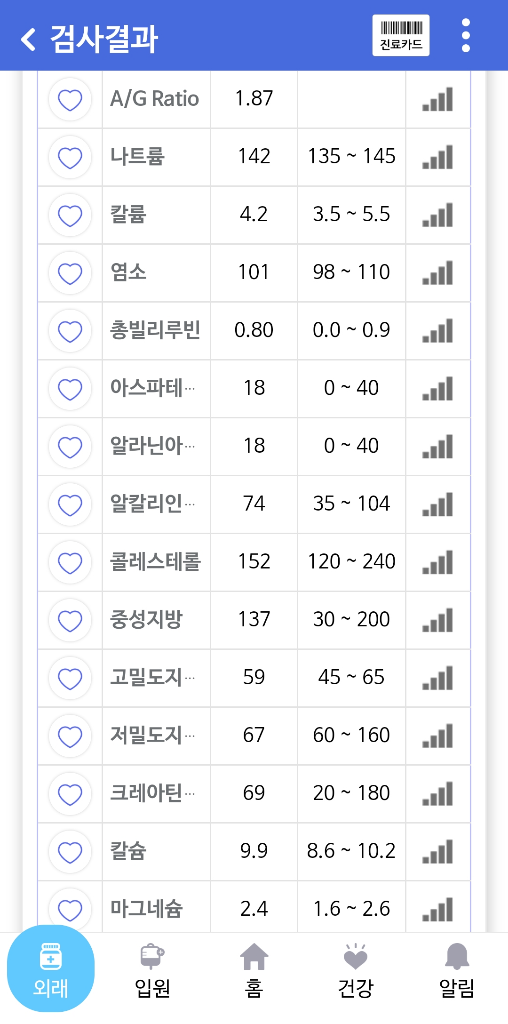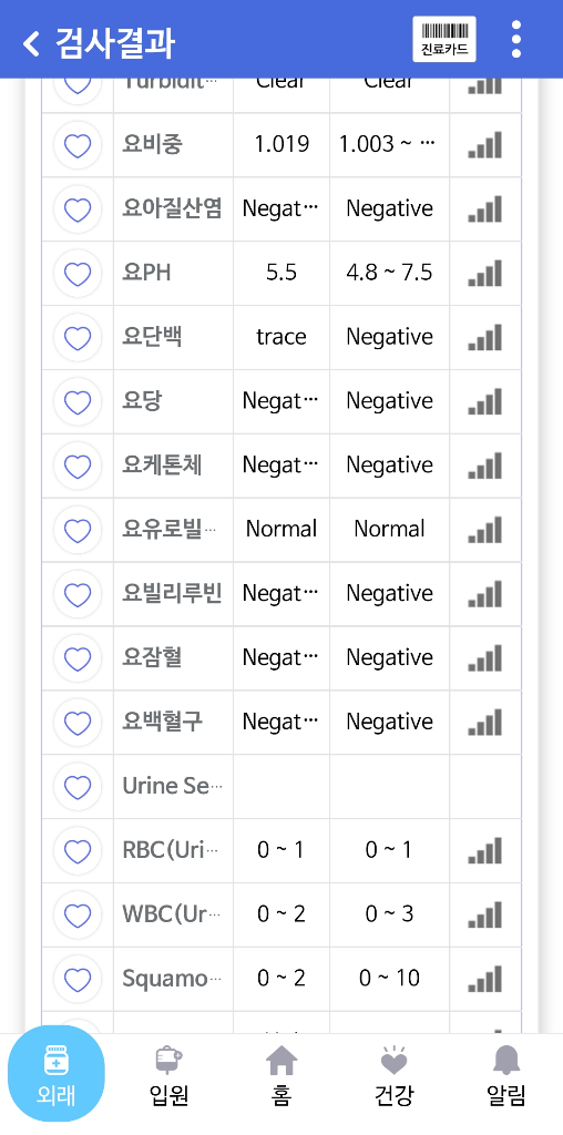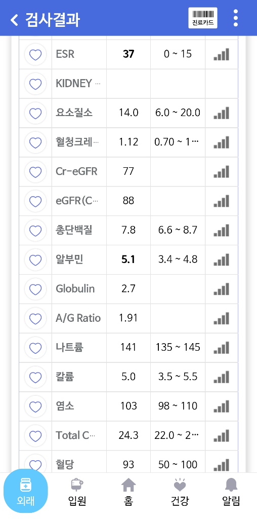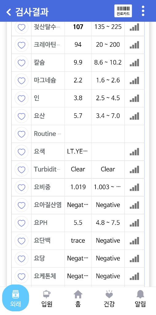 신기능이 정상보다는 약간 감소되어 있고, 요단백도 약양성으로 검출이 됩니다. 혈압 조절을 잘 하고 계신지 모르겠어요. 혈압 조절만 잘 하시면 더 나빠지지는 않거든요. 나머지 검사는 별 문제는 없네요.