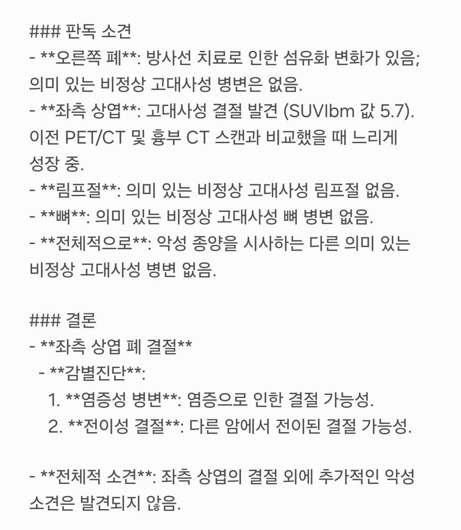 염증성 병변이 있다는 것이 아니라 악성으로는 보기 어려운 병변이 있다는 이야기이며 그 중 하나의 예시로 염증성 병변을 예로 든 것입니다