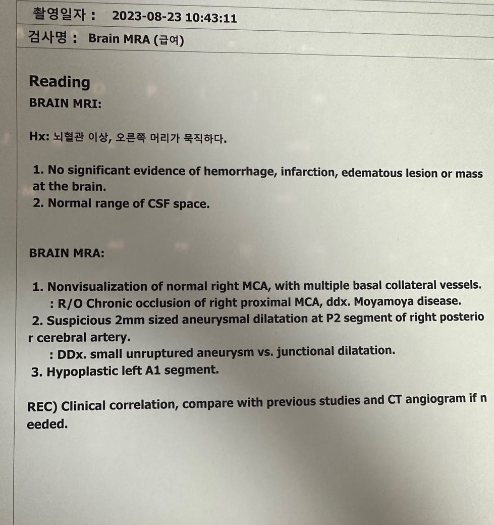 따라서 말씀하신대로 동맥류에 대한 정확한 확인을 요하는 상황이며 만일 추가검사를 진행한다면 뇌동맥 조영술이 될 가능성이 높겠습니다.