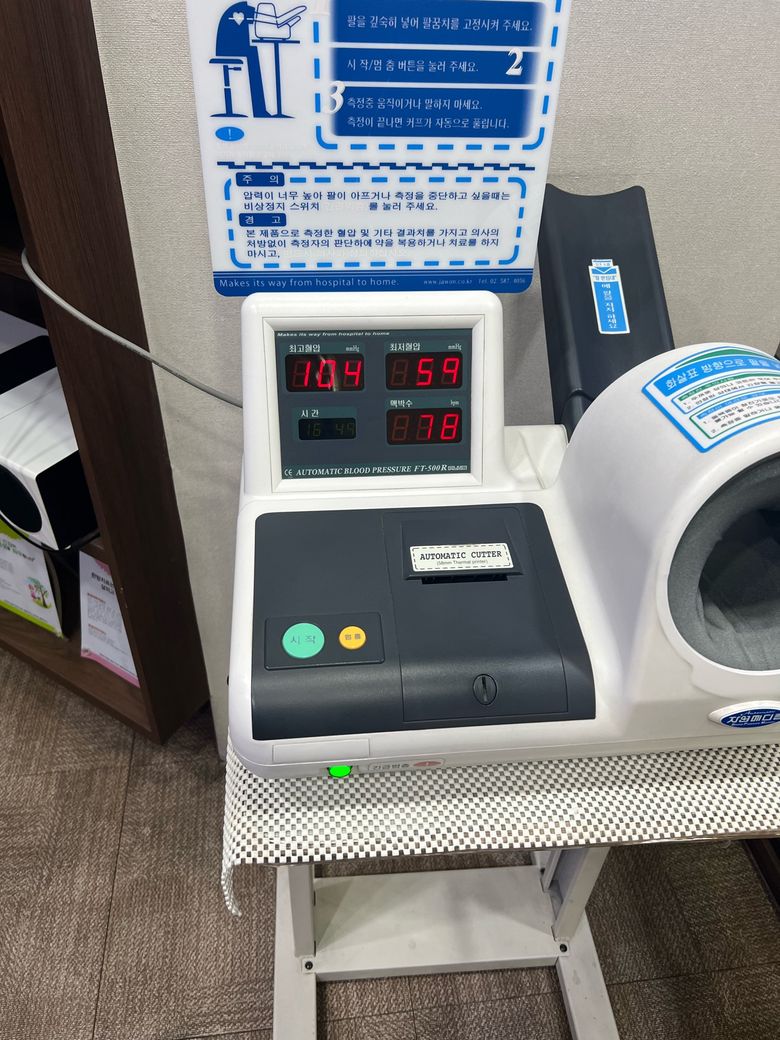 사진상 혈압은 수축기 104 mmHg, 이완기 59 mmHg, 맥박수 78회로 확인됩니다. 수치만 보면 성인 기준에서 “정상 범위의 하한선 또는 경계 저혈압” 수준이며, 단독으로는 병적 저혈압으로 보기는 어렵습니다.
