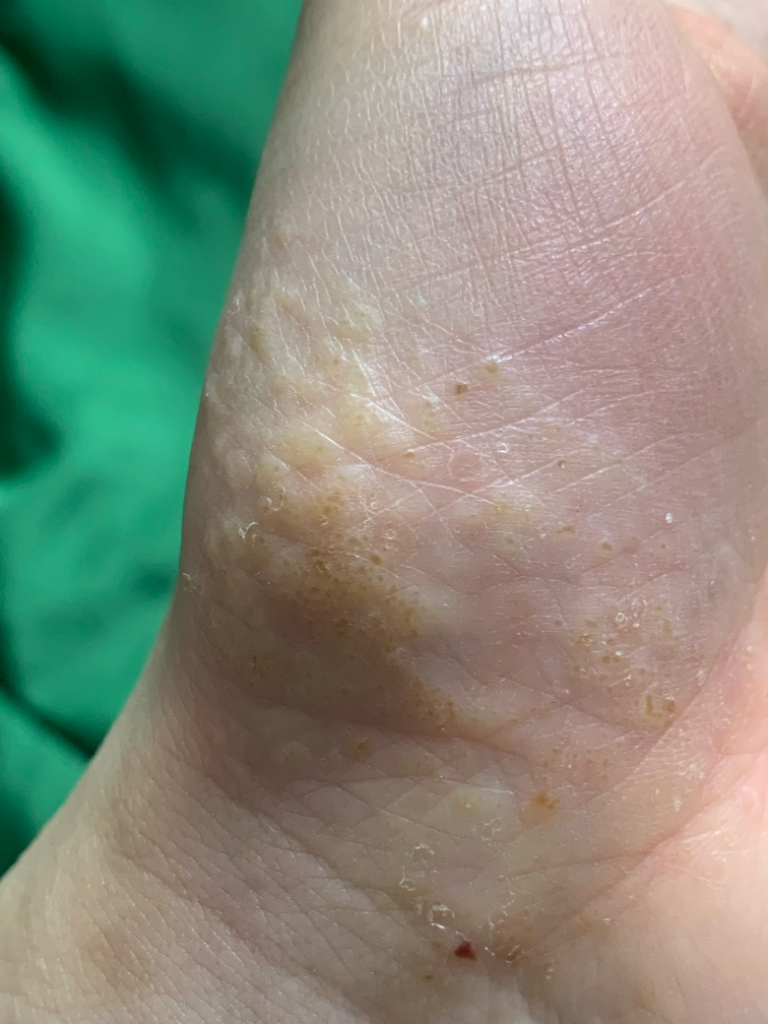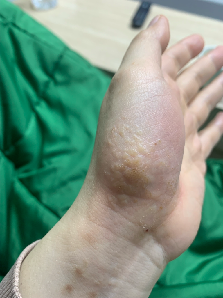 손바닥에 생기는 병변은 한포진 같습니다. 매우 가려우실 거고 일반적인 두드러기 약으로는 효과가 떨어질 겁니다. 바르는 스테로이드 연고도 강하게 써야 될 것 같구요. 피부과에 가셔서 꾸준히 관리를 받으시기 바랍니다.