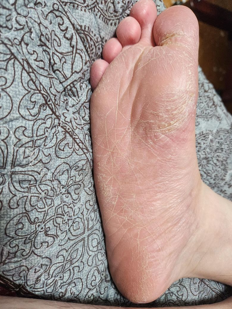 앞이 막힌 슬리퍼 물기 찬 상태로 신고 물기를 충분히 빼놓은 상태로 장시간 쓰는데 점점 증세가 악화되더니 이렇게 변했고 기존에 있던 지간형 무좀 유사증상은 각질에 뒤덮혀 사라졌어요.