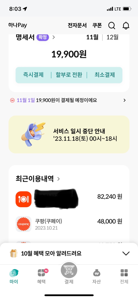 연회비는 확정인 것 같으며, 나머지 금랙은 11월 1일 이후의 날에 결제될 것으로 추정됩니다.