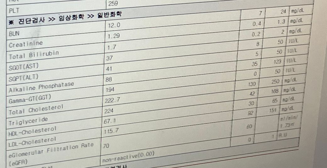 간 수치는 AST 및 ALT 수치입니다. 정상 범위 내에 있으며 높지 않습니다. 그보다는 중성지방의 수치가 살짝 높은 것 같습니다.