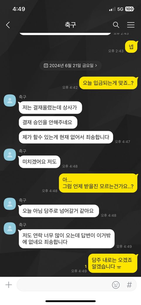 급여는 모든 경기 끝나는날(14일) 기준 익주 안에 지급된다 하였고, 익주 금요일 (21일)이 되는날 알바를 모집한 사람한테 연락하니 대화 내용 보시면 아시겠지만 저렇다며 상사의 승인이 없어서 돈을 못준다 하더라고요
