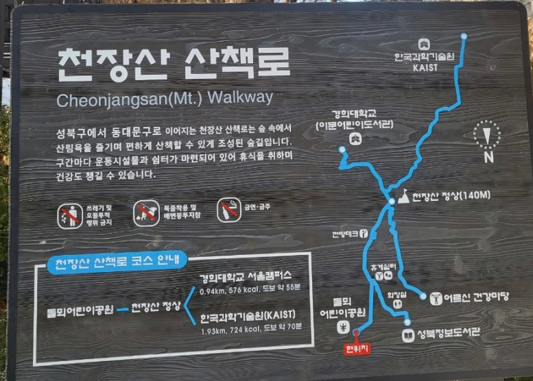 동대문구와 성북구에 걸쳐 있는 천장산은 해발 140m의 낮고 완만해 가벼운 산책 같은 산행을 할 수 있는 곳이에요. 외대 쪽을 시작으로 천장산 숲길을 걸어 한국과학기술원 KAIST에서 마무리되는 코스로 등산코스 추천드립니다!