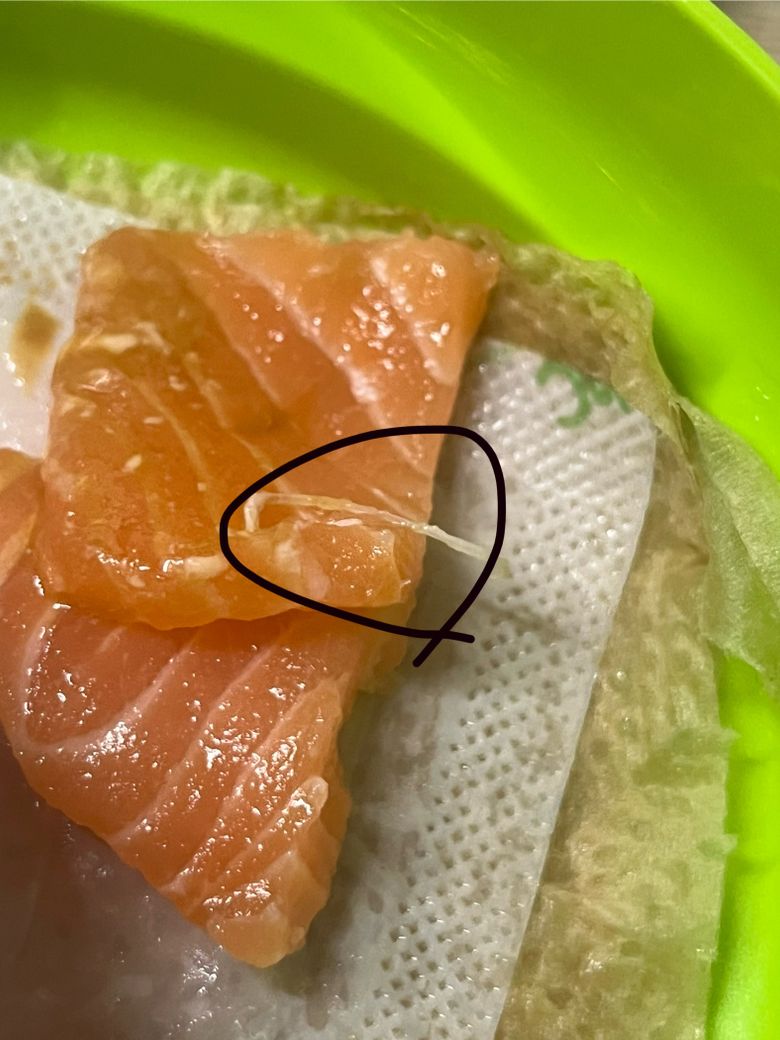 진공포장된 횟감용 연어를 구입했는데 이거 기생충인가요?… 두번째 사진에 있는건 흐물흐물한데 첫번째 사진 껀 꽤 빳빳합니다.. 유효기간이 포장일로부터 16일까지던데 유효기간 다 되어갈때쯤 개봉했습니다