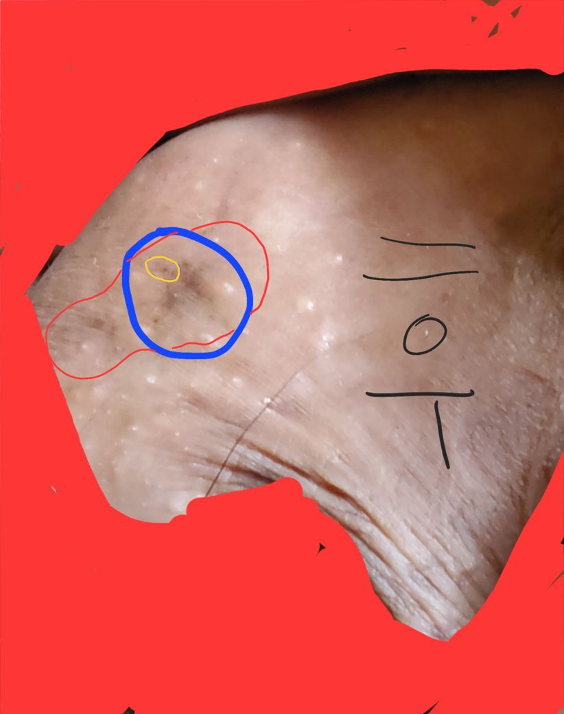 그리고 약 한달이 지난 지금, 제가 우연히 씻다가 그 진찰 받았던 점을 보게되었는데(아래 사진의 파란색 원 안의 × 자 모양의 점 입니다), 점이 더 커지고 진해진것 같아서 자세히 살펴보니 전에 없던 부분(아래 사진의 노란색 원 안의 점 입니다)이 번진것처럼 추가적으로 더 생겨있었고(이것때문에 제가 점이 더 커진것처럼 본것 같습니다), 확실히 더욱 진해진것 같다는 느낌이 드는데요, 이것때문에 피부암은 아닐지 걱정이 되어서 피부과에 재방문을 해야할지,