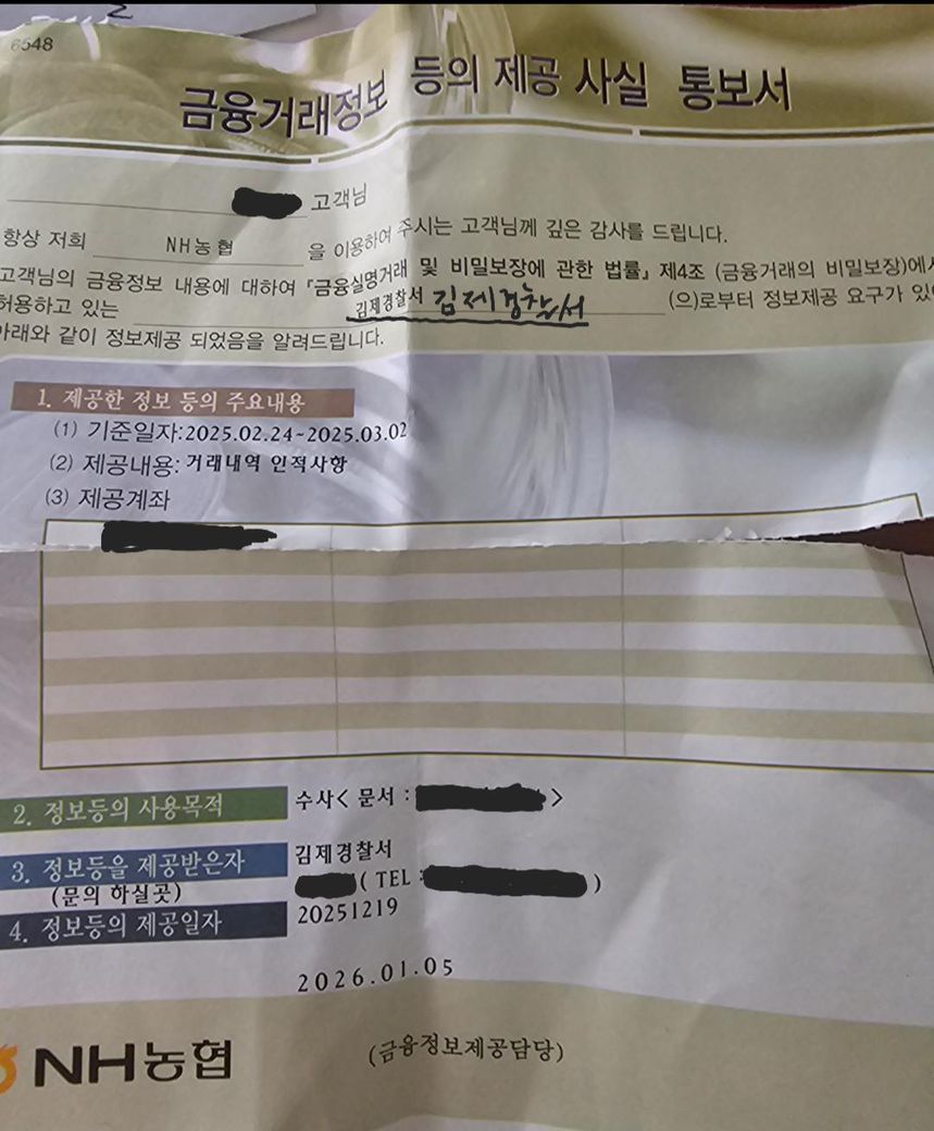 농협으로 금융거래정보 등의 제공사실통보서 받았어요